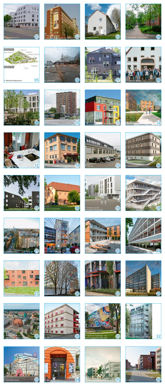 Zur Auswahl der 6 Fallstudien, die in diesem Forschungsprojekt empirisch untersucht wurden im erstem Schritt 36 bundesweite Wohnprojekte erfasst. Begeben Sie sich mit uns auf eine Deutschlandreise zu den 36 integrativen Wohnprojekten. Alle Projekte werden hier kurz vorgestellte und nach sechs sozialen und architektonischen Kriterien bewertet (Stand 2018).