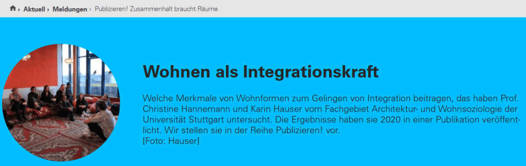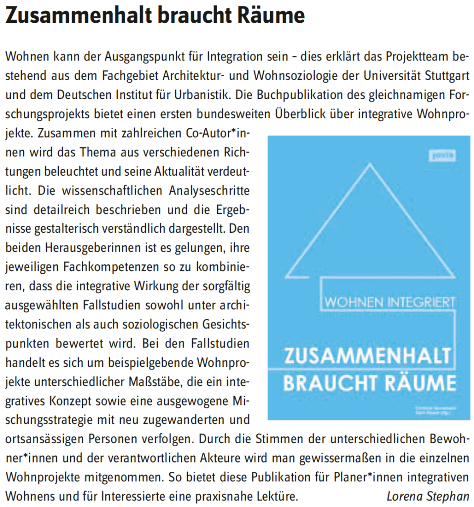 So bietet dieses Buch den ersten bundesweiten Überblick zu integrativen Wohnprojekten inklusive einer fundierten Bewertung und einer Darstellung der Möglichkeiten, wie sie weiter verbreitet und übertragen werden können. Denn, so das Fazit: Diese können «einen positiven Einfluss auf Integration haben»