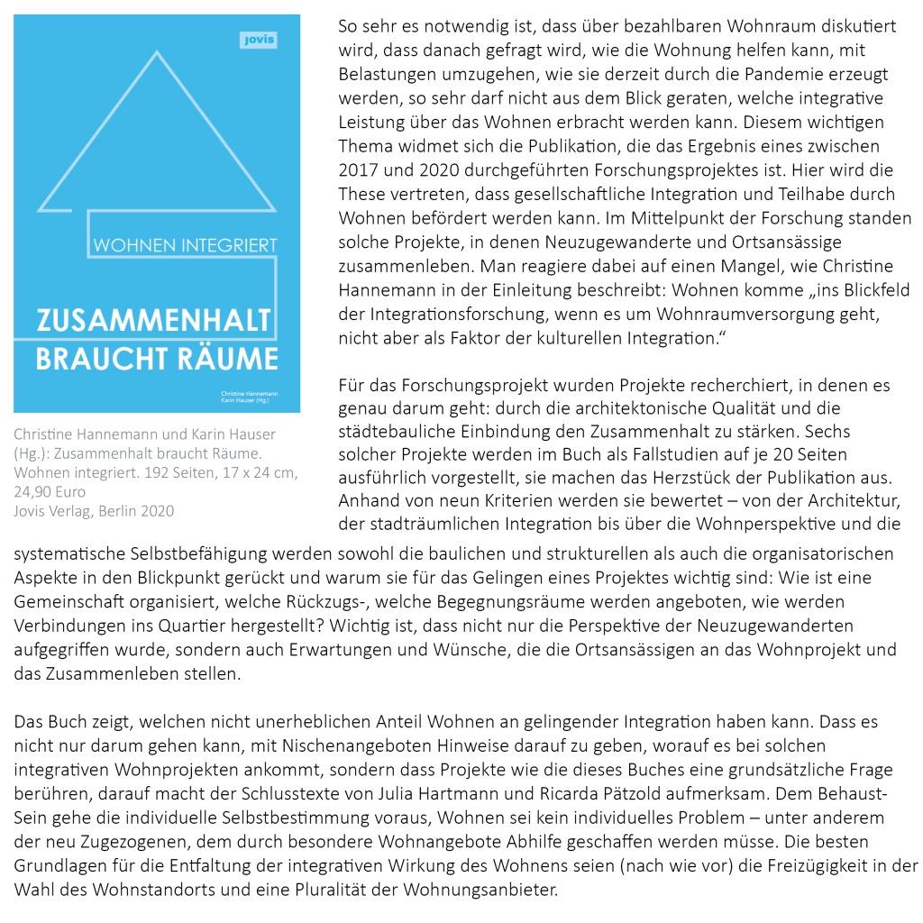 Kohout, Raphaela und Ana Rogojanu. 2023. Rezension zu: Hannemann, Christine; Hauser, Karin (Hg.) 2020: Zusammenhalt braucht Räume. Wohnen integriert. Berlin: Jovis Verlag. In: Schmidt-Lauber, Othengrafen et al. (Hg.) 2023: Jahrbuch Stadtregion 2021/2022. Stadt-Land-Relationen. Disziplinäre Spurensuchen. Wiesbaden: Springer VS. S. 277-280. PDF