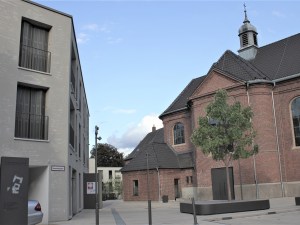 Neubauten im ehemaligen Klostergarten und auf dem Vorplatz neben alter Kirche + Kloster der Klarissen aus rotem Ziegelstein