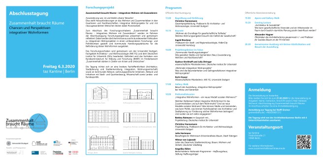 Am 6. März 2020 fand in Berlin die Abschlusstagung „Zusammenhalt braucht Räume – Chancen und Perspektiven integrativer Wohnformen“ statt. Mit dem Fachpublikum wurde darüber diskutiert, was dynamische Wanderungsprozesse für das Zusammenleben und den sozialen Zusammenhalt bedeuten und welche Integrationskraft das Wohnen entfalten kann. Die Tagung bildete den Abschluss des Forschungsprojekts „Zusammenhalt braucht Räume – integratives Wohnen mit Zuwanderern“.
